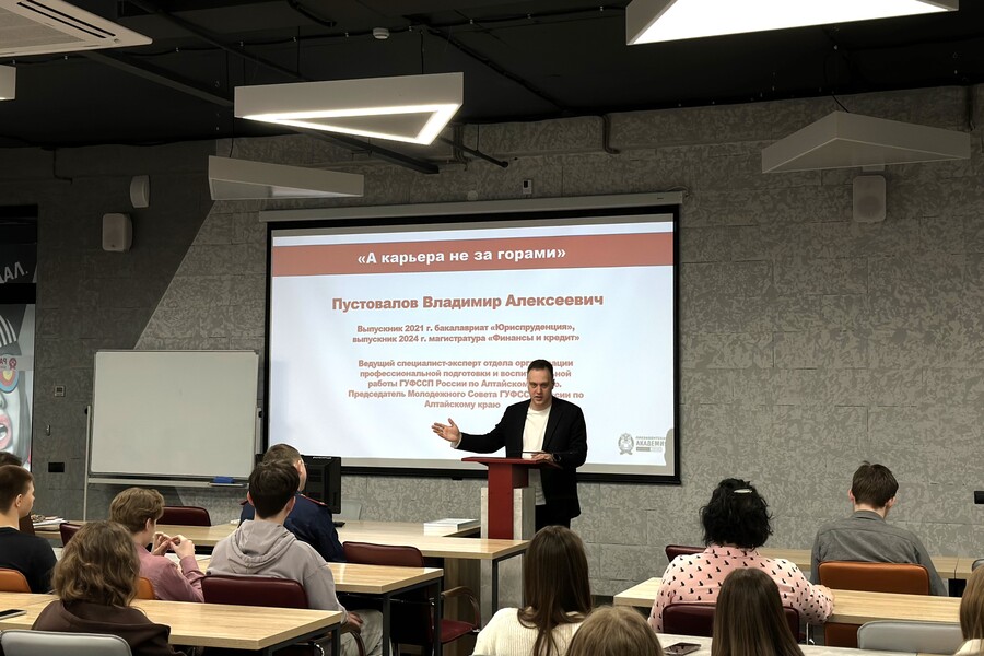 На первую встречу со студентами в качестве спикера пригласили Владимира Пустовалова, ведущего специалиста-эксперта отдела организации профессиональной подготовки и воспитательной работы ГУ ФССП по Алтайскому краю, председателя Молодежного Совета ГУФССП России по Алтайскому краю, выпускника бакалавриата 2021 года направления «Юриспруденция», магистратуры 2024 года направления «Финансы и кредит», и Елисея Гаенко, выпускника бакалавриата 2024 года и магистранта направления «Юриспруденция», следователя Бийского межрайонного следственного отдела, прикомандированного в третий по расследованию особо важных дел СУ СК России по Алтайскому краю.