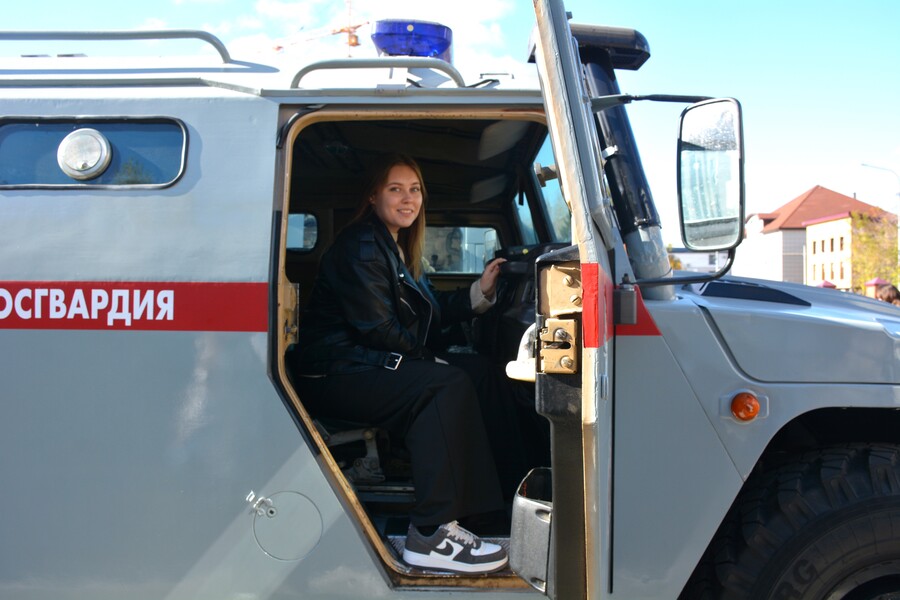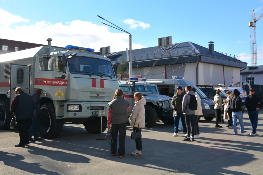 Программа разделилась на три блока. Студенты посетили выставку военной техники, на которой смогли посмотреть бронеавтомобиль «Тигр», КАМАЗ для перевозки личного состава, бронированный УАЗ «Есаул», форд-транзит АРАГС (с инженерно-саперным оборудованием). Также ребята познакомились с экспонатами музейного фонда комнаты боевой славы ОМОН «Алтай», в том числе с пистолетом Макарова, автоматом Калашникова, бронежилетом.