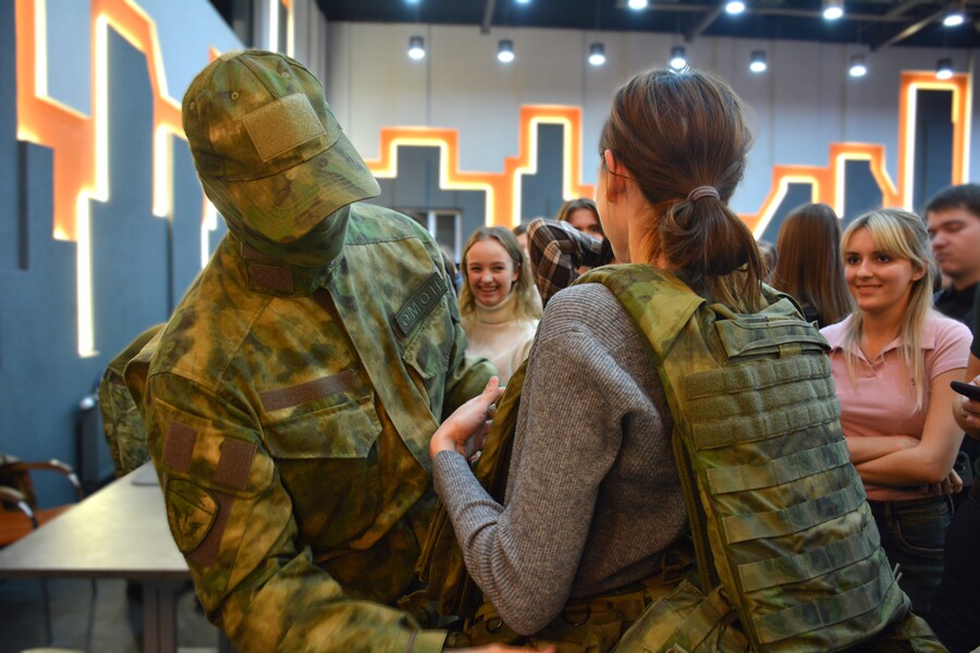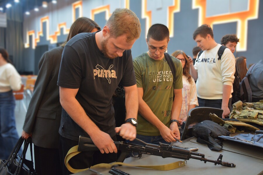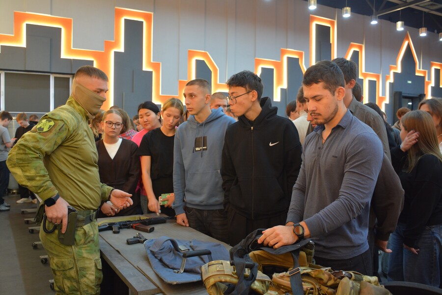 Далее программа продолжилась на интерактивной площадке, где студенты попробовали разобрать и собрать автомат Калашникова и пистолет Макарова, а также посмотрели ролик про ОМОН «Алтай», благодаря которому познакомились с деятельностью отряда. Каждый желающий смог примерить на себя экипировку бойца, а также задать все интересующие вопросы.