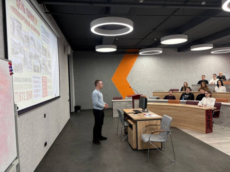 Виктор Исаев, доцент кафедры гуманитарных и естественнонаучных дисциплин, познакомил студентов с событиями Великой Отечественной войны и героической борьбы военнослужащих и жителей блокады Ленинграда с немецко-фашистскими захватчиками. Ленинград стал символом мужества, несгибаемости советского народа, стремившегося отстоять независимость народа.