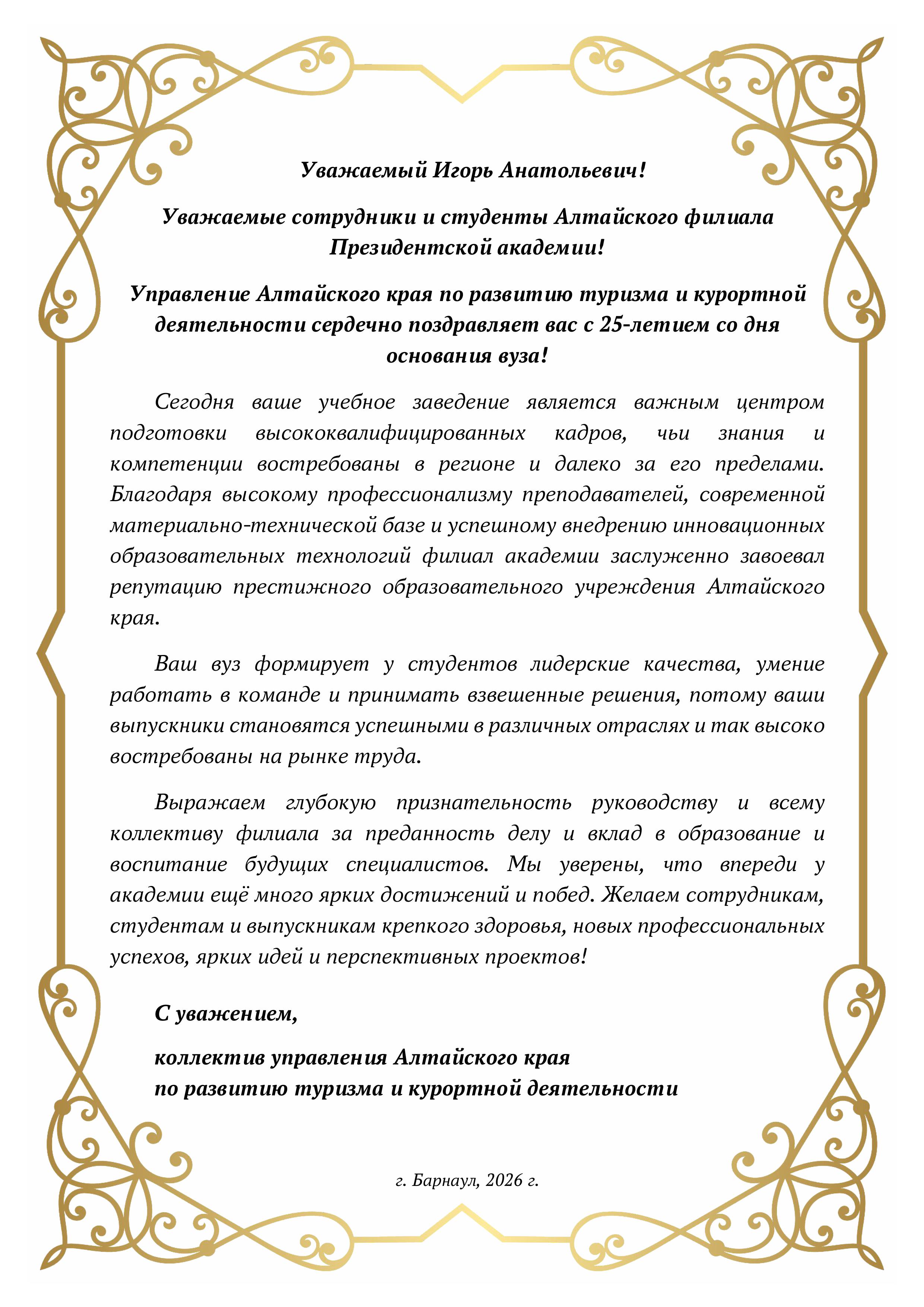Поздравление от коллектива управления Алтайского края по развитию туризма и курортной деятельности