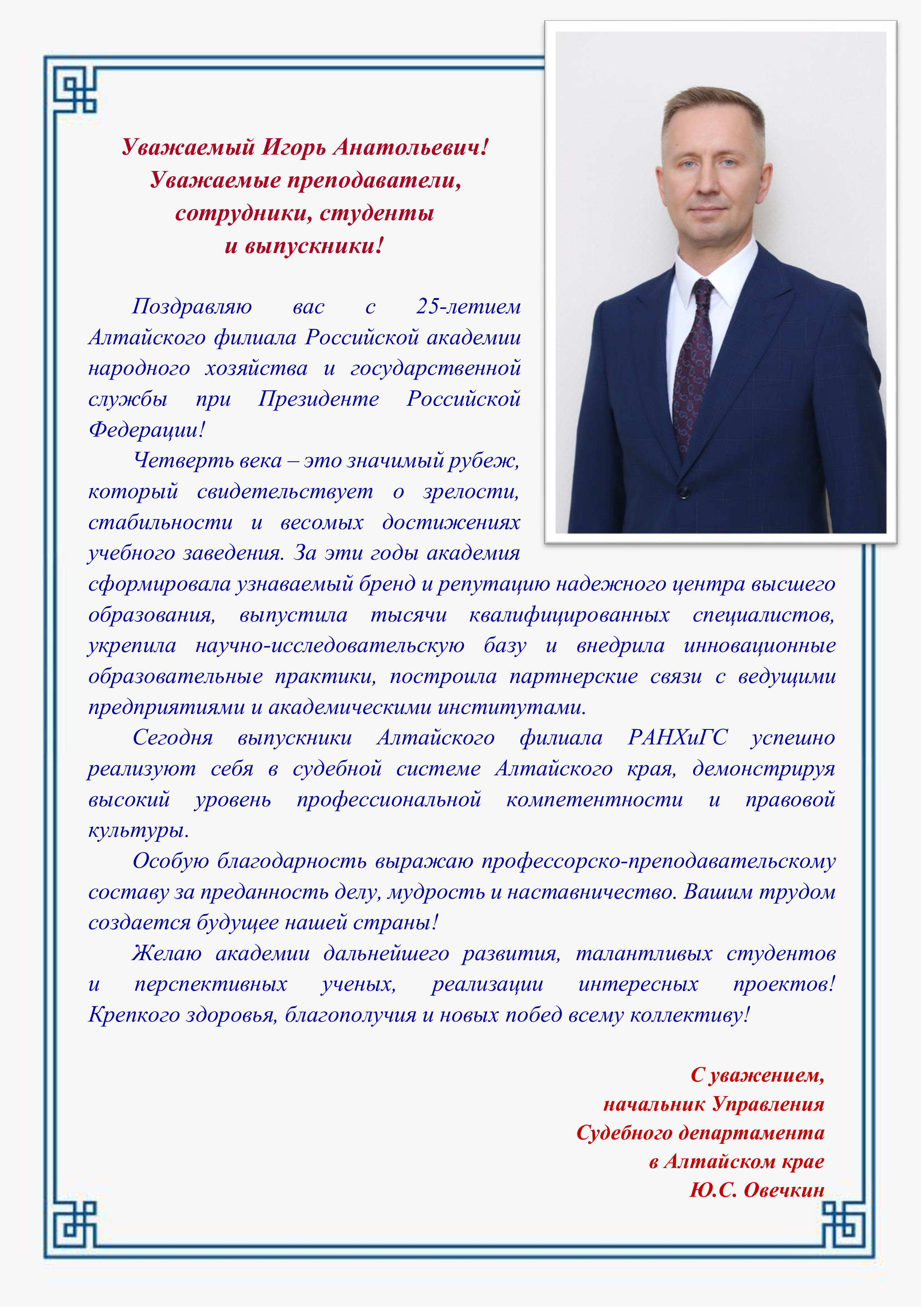 Поздравление от начальника Управления Судебного департамента в Алтайском крае Юрия Овечкина