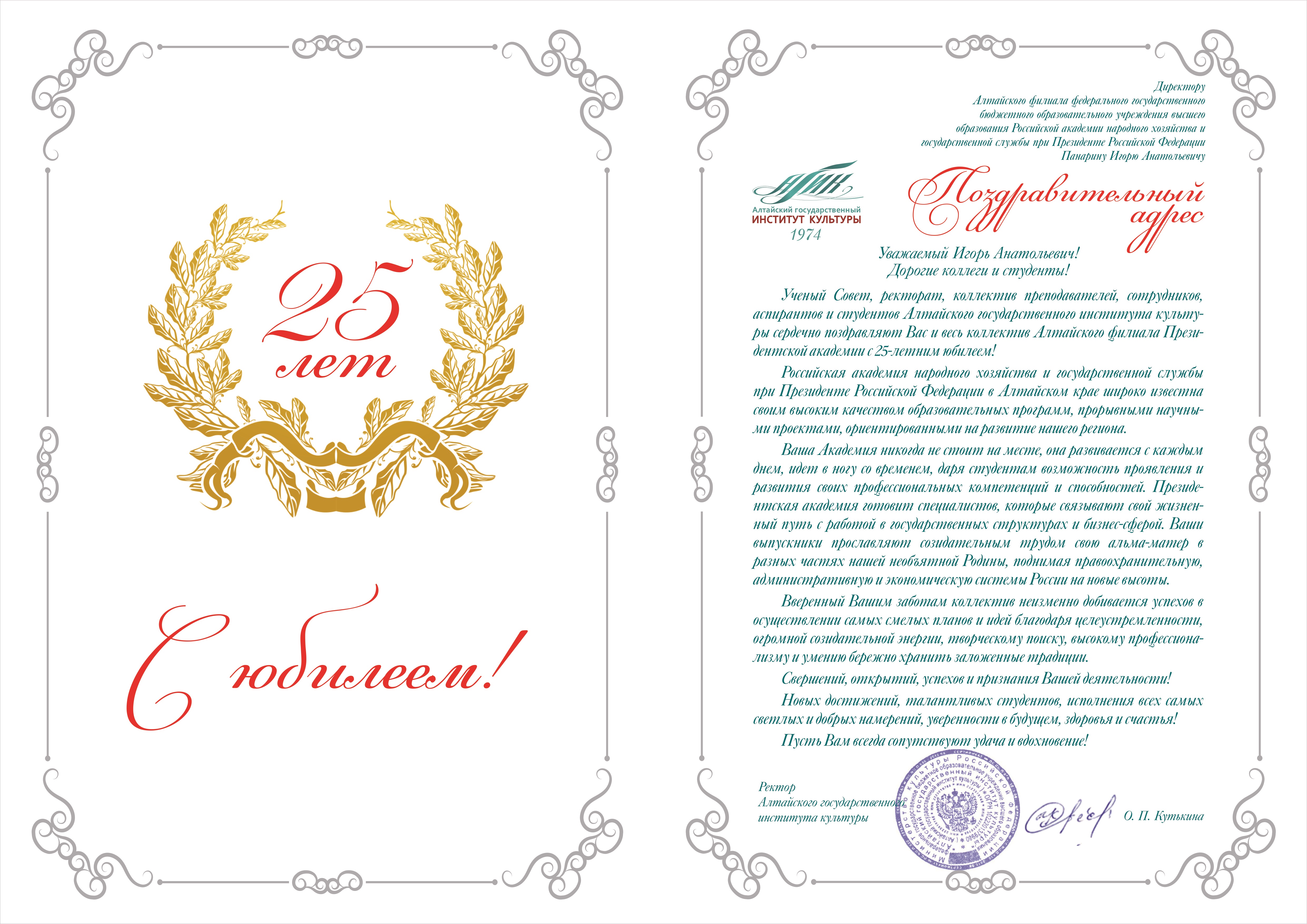 Поздравление от ректора Алтайского государственного института культуры Олеси Кутькиной