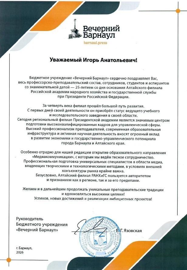 Поздравление от руководителя Бюджетного учреждения «Вечерний Барнаул» Елены Язовской