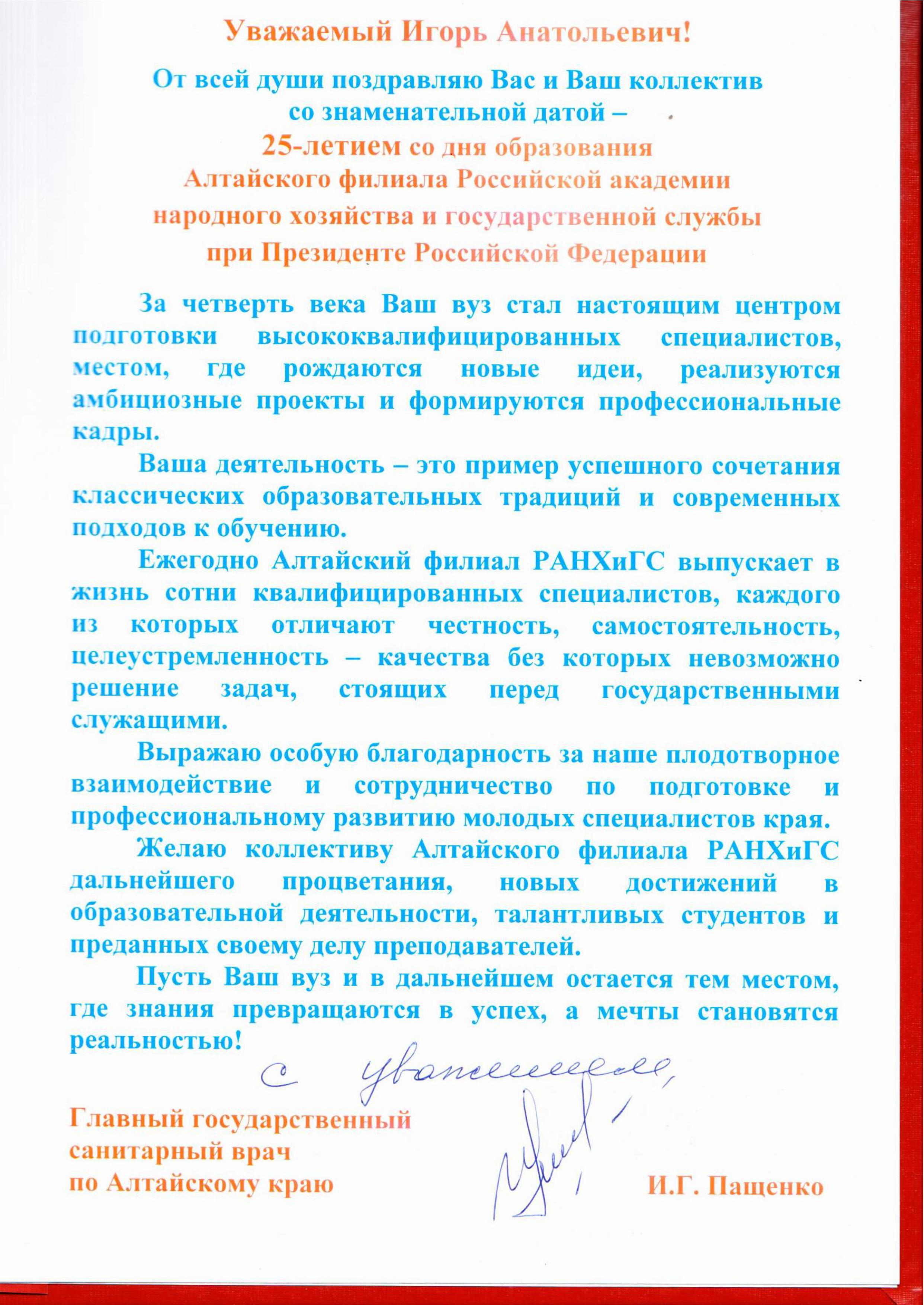 Поздравление от руководителя Управления Роспотребнадзора по Алтайскому краю Ирины Пащенко