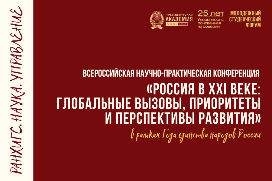 Мероприятие состоится 14-15 апреля на базе Алтайского филиала Президентской академии. Для участия необходимо подать заявку и тезисы на научно-образовательном портале «Ломоносов» до 1 апреля. Рабочие языки конференции: русский, английский.