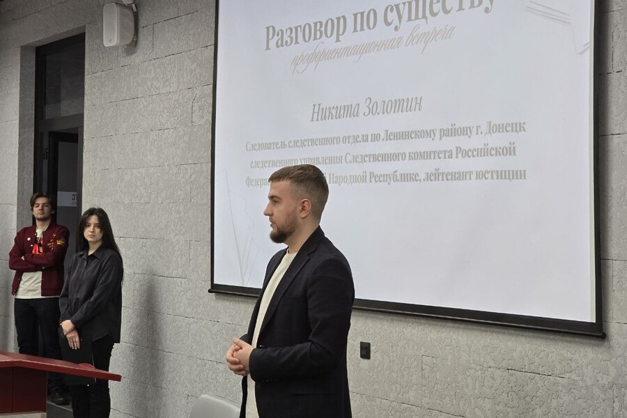 Студенты пообщались с Никитой Золотиным, следователем следственного отдела по Ленинскому району г. Донецк следственного управления Следственного комитета Российской Федерации по Донецкой Народной Республике, лейтенантом юстиции. Встречу организовали Центр карьеры и актив юридического факультета.