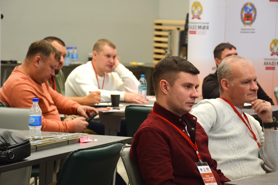 Затем прошли занятия по образовательным дисциплинам, в рамках которых эксперты поделились своими знаниями и опытом. В первой части обсуждались вопросы промышленного сектора и промышленной политики Российской Федерации. С участниками поработали Елена Лукина, заведующий кафедрой экономики и финансов Алтайского филиала РАНХиГС, к. э. н., Вячеслав Химочка, министр промышленности и энергетики Алтайского края, и представитель Союза промышленников Вячеслав Мещеряков.