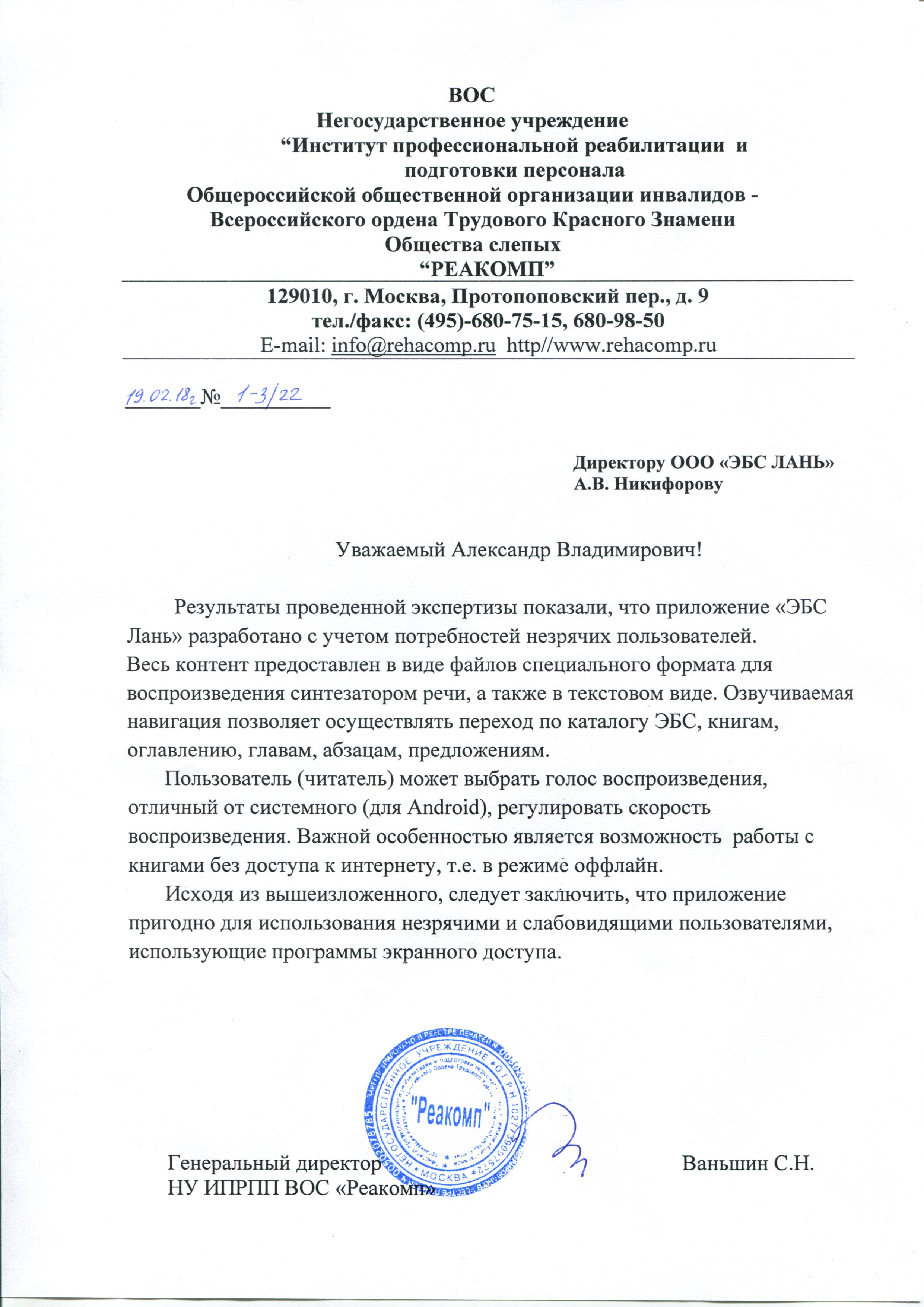 - Приложение «ЭБС Лань». Весь контент представлен в виде файлов специального формата для воспроизведения синтезатором речи, а также в текстовом виде. Озвучиваемая навигация позволяет осуществлять переход по каталогу ЭБС к книгам, оглавлению, главам, абзацам, предложениям. Пользователь (читатель) может выбрать голос воспроизведения, отличный от системного (для андроид), регулировать скорость воспроизведения. Важной особенностью является возможность работы с книгами без доступа к Интернету, то есть в режиме оффлайн.