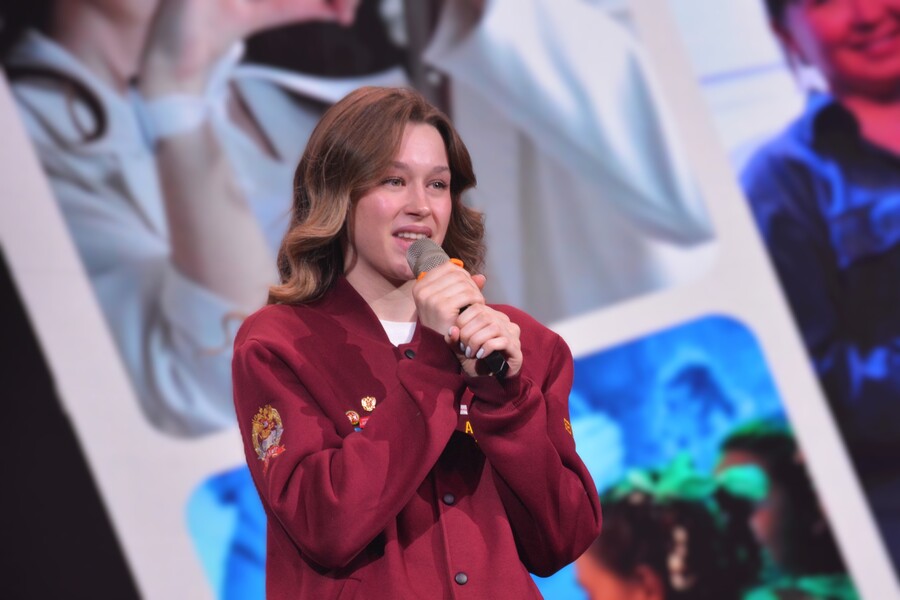 Для приветствия и поздравления на сцену поднялась Председатель Студенческого совета Мария Белобородова.