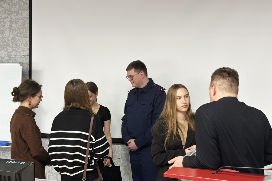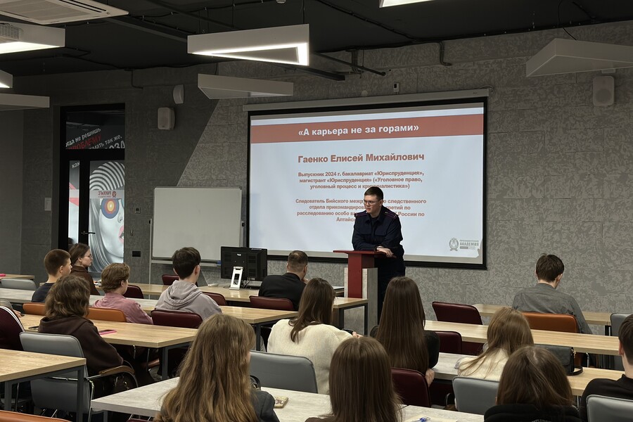 На первую встречу со студентами в качестве спикера пригласили Владимира Пустовалова, ведущего специалиста-эксперта отдела организации профессиональной подготовки и воспитательной работы ГУ ФССП по Алтайскому краю, председателя Молодежного Совета ГУФССП России по Алтайскому краю, выпускника бакалавриата 2021 года направления «Юриспруденция», магистратуры 2024 года направления «Финансы и кредит», и Елисея Гаенко, выпускника бакалавриата 2024 года и магистранта направления «Юриспруденция», следователя Бийского межрайонного следственного отдела, прикомандированного в третий по расследованию особо важных дел СУ СК России по Алтайскому краю.