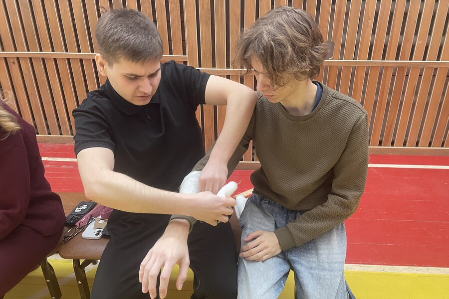 Очень подробно разобрали тему кровотечений. Нам не просто показали жгут, а дали примерить его друг на друге: накладывать на бедро и плечо, засекать время, понимать, как сильно затягивать, чтобы не навредить, но остановить кровь. Отработали наложение бинтов – от простых круговых до сложных на локтевые суставы.