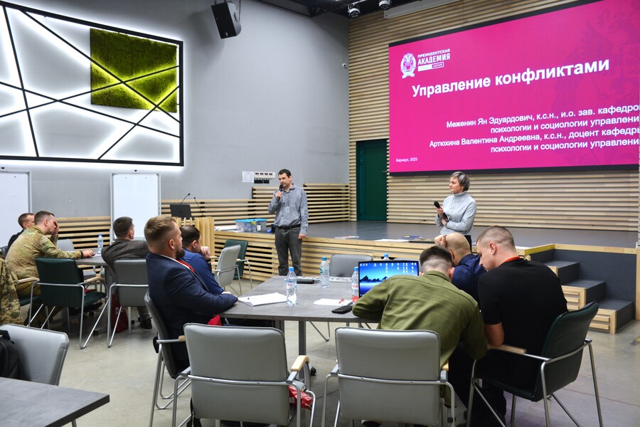 Продолжением учебного дня стал тренинг «Управление конфликтами», проведенный сотрудниками кафедры психологии и социологии управления Алтайского филиала РАНХиГС: Яном Межениным, и.о. зав. кафедрой психологии и социологии управления, к. соц. н., и Валентиной Артюхиной, заместителем заведующего кафедрой психологии и социологии управления, к. соц. н.