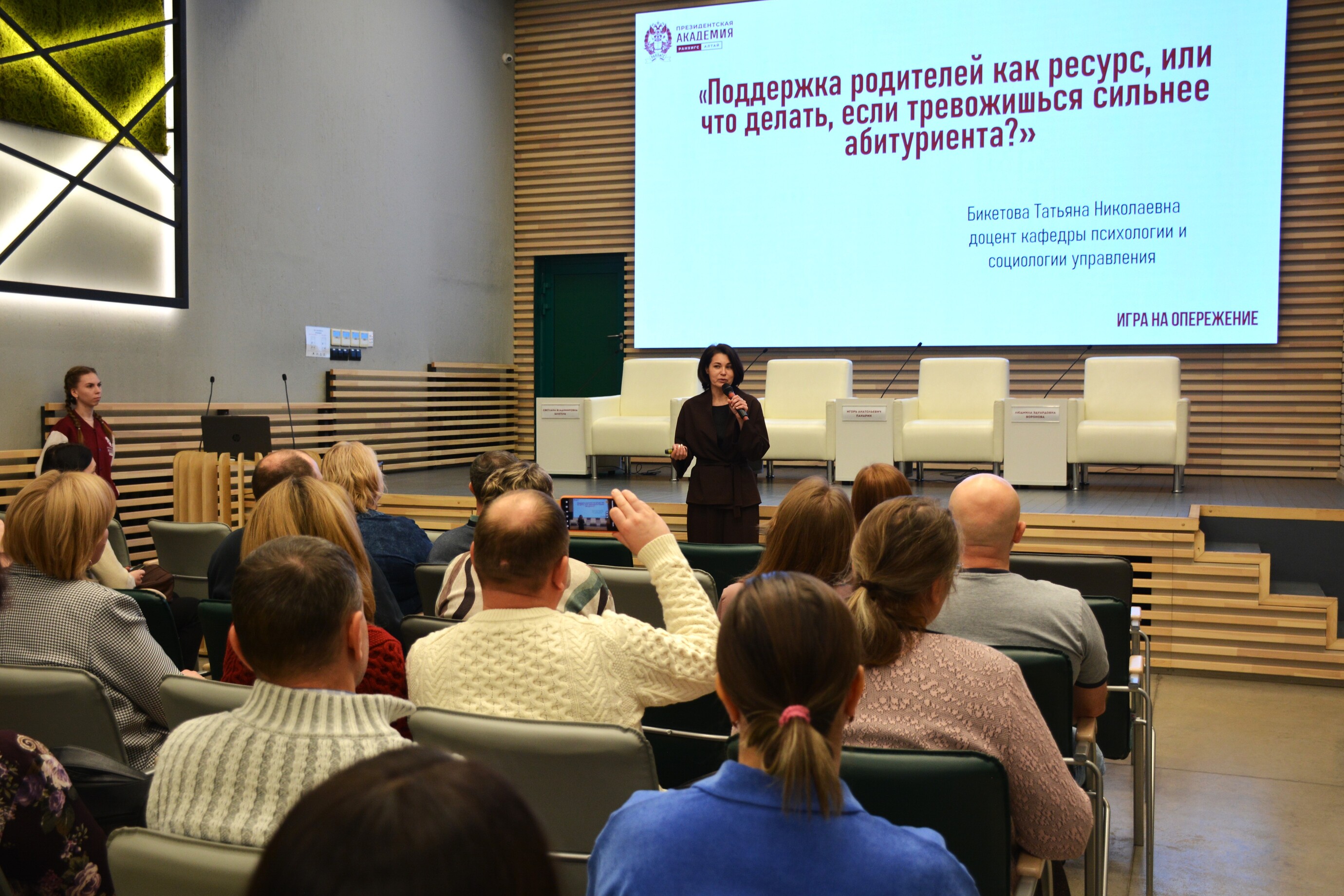 В этот день состоялась образовательная площадка для родителей «Поддержка родителей как ресурс, или Что делать, если тревожишься сильнее абитуриента?» Спикером площадки выступила Татьяна Бикетова, доцент кафедры психологии и социологии управления Алтайского филиала РАНХиГС.