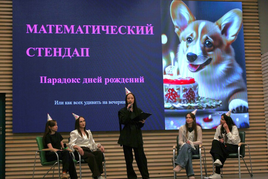 Ребята выступали с шутками на математические термины, формулы, и даже сложные темы, но делали легко и смешно, что было понятно и интересно всем. Особенно понравилось, как они обыгрывали понятия матрицы и определителя в повседневных ситуациях. Зал постоянно смеялся и поддерживал выступающих. Чувствовалось, что участники действительно любят математику и умею смотреть на нее с юмором.