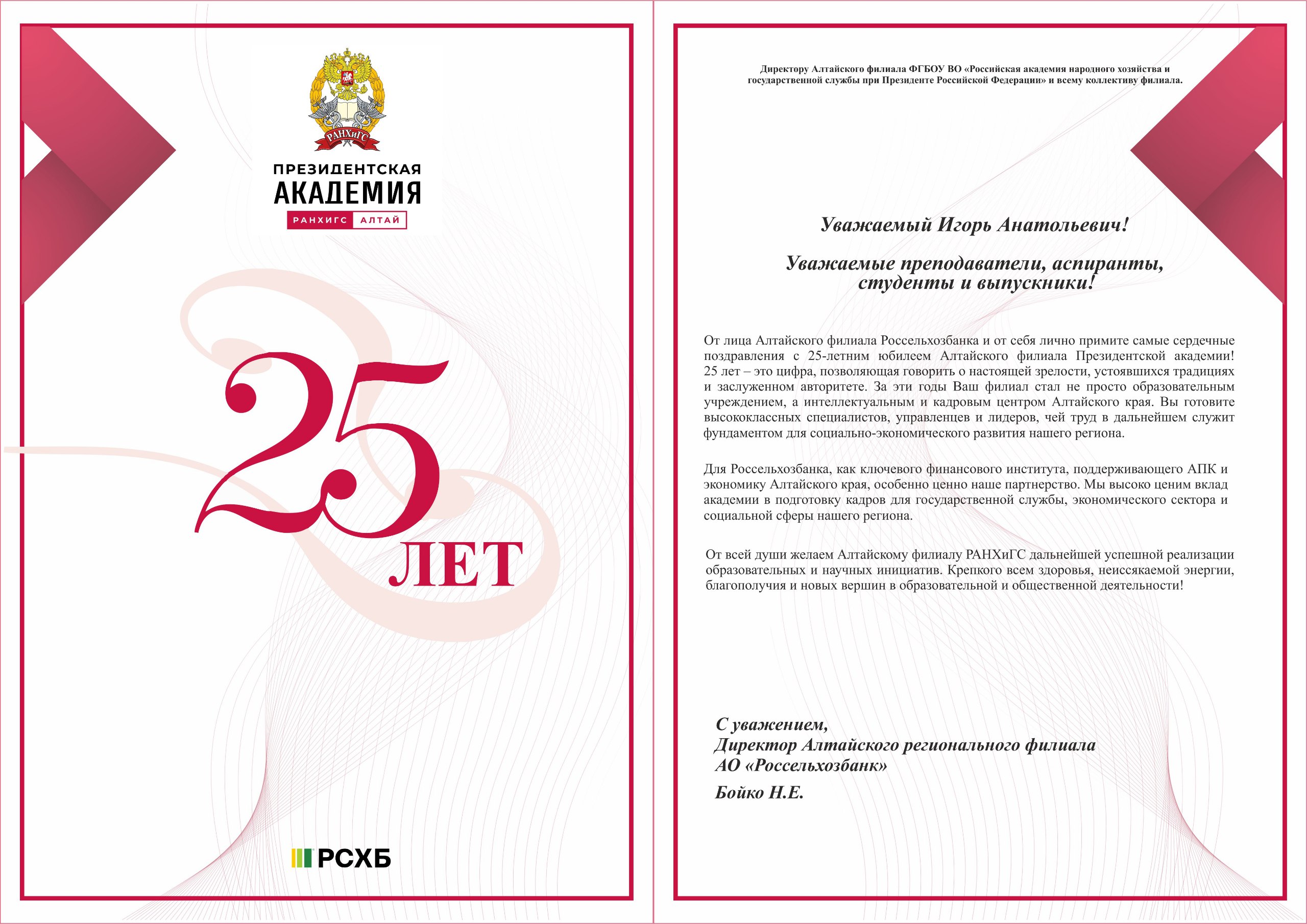 Поздравление от Директора Алтайского регионального филиала АО «РоссельхозБанк» Николая Бойко