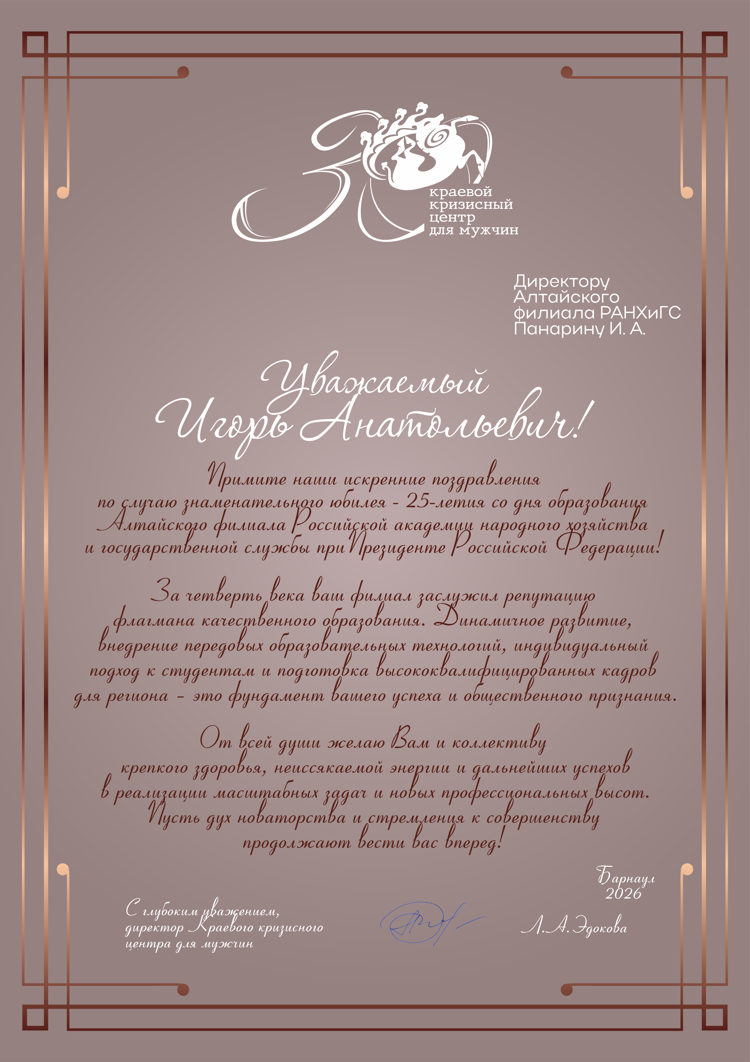 Поздравление от директора Краевого кризисного центра для мужчин Ларисы Эдоковой