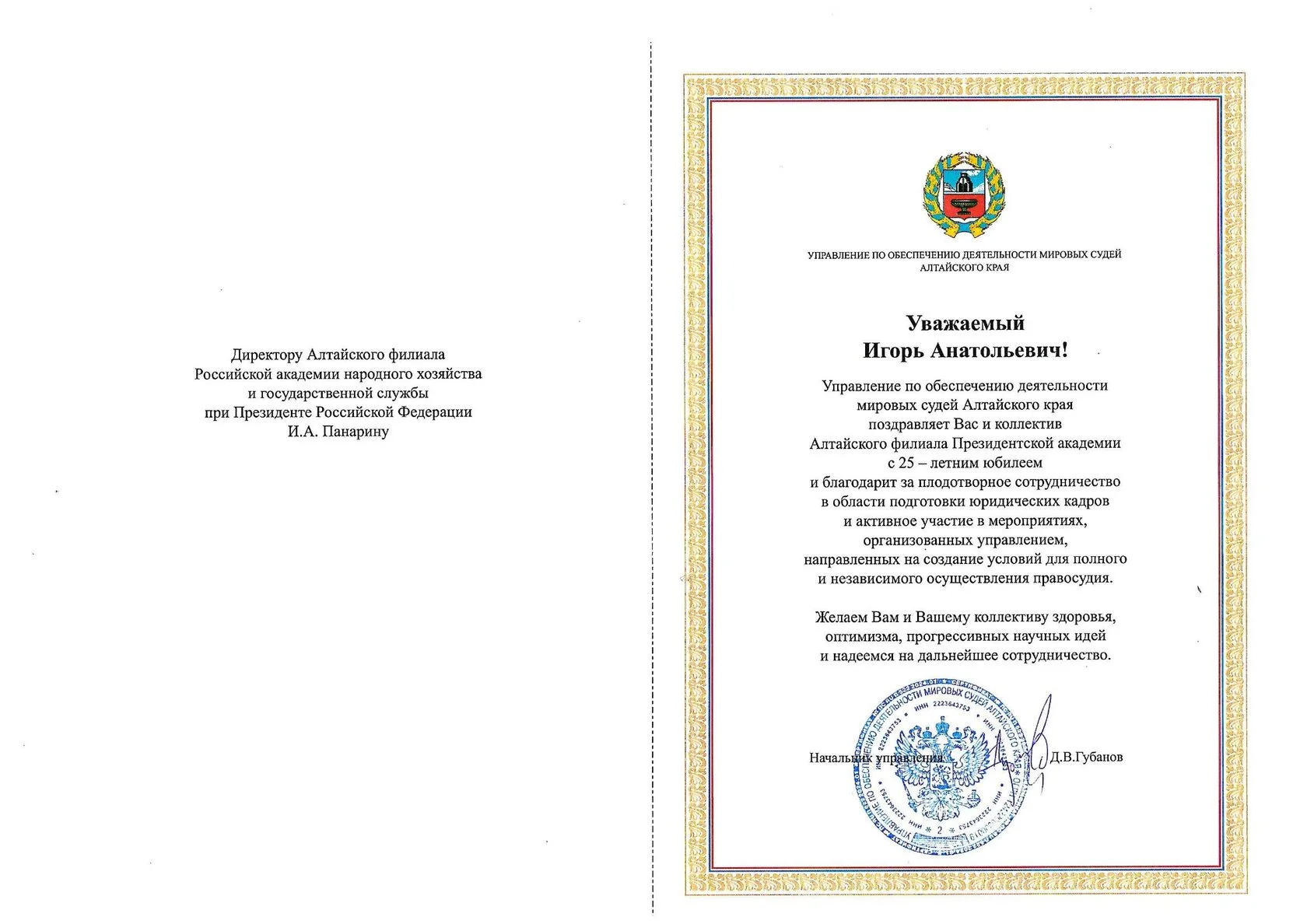 Поздравление от начальника управления по обеспечению деятельности мировых судей Алтайского края Дмитрия Губанова