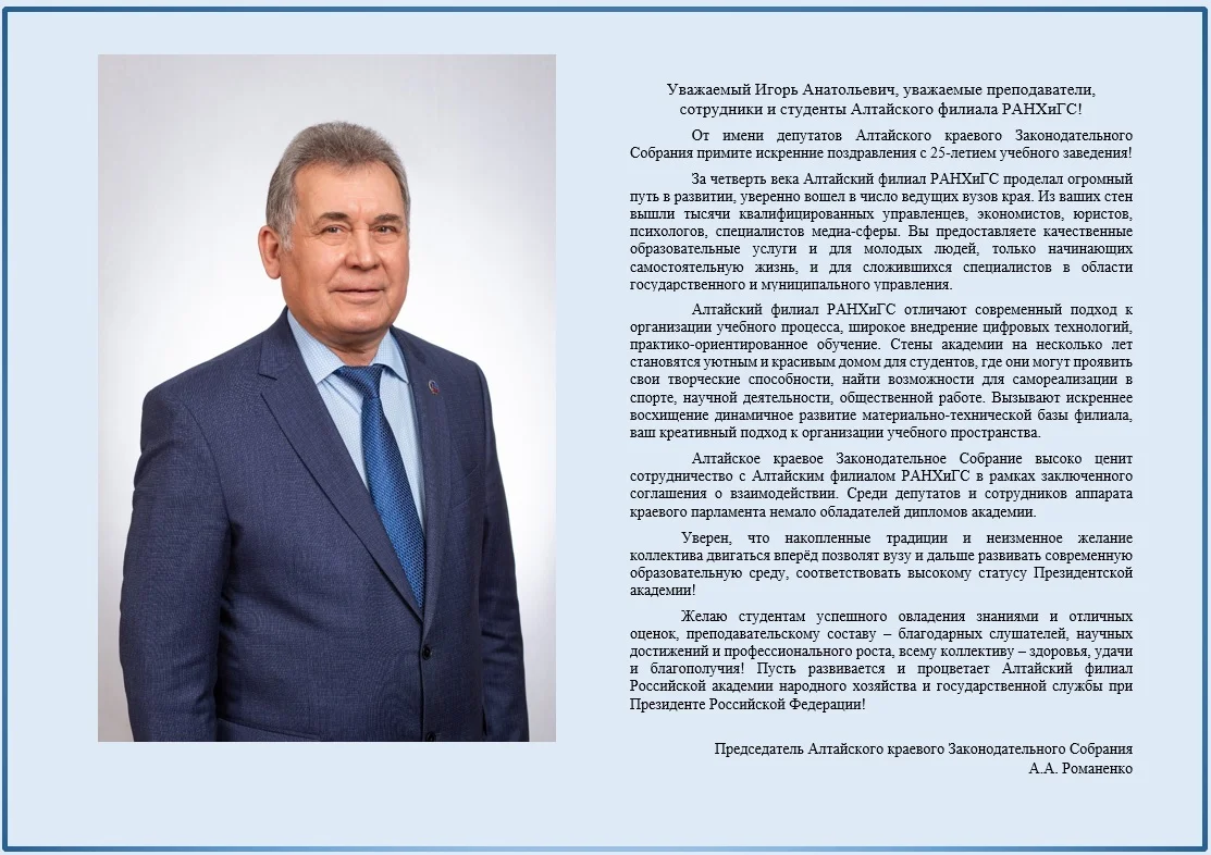 Поздравление от Председателя Алтайского краевого Законодательного Собрания Александра Романенко