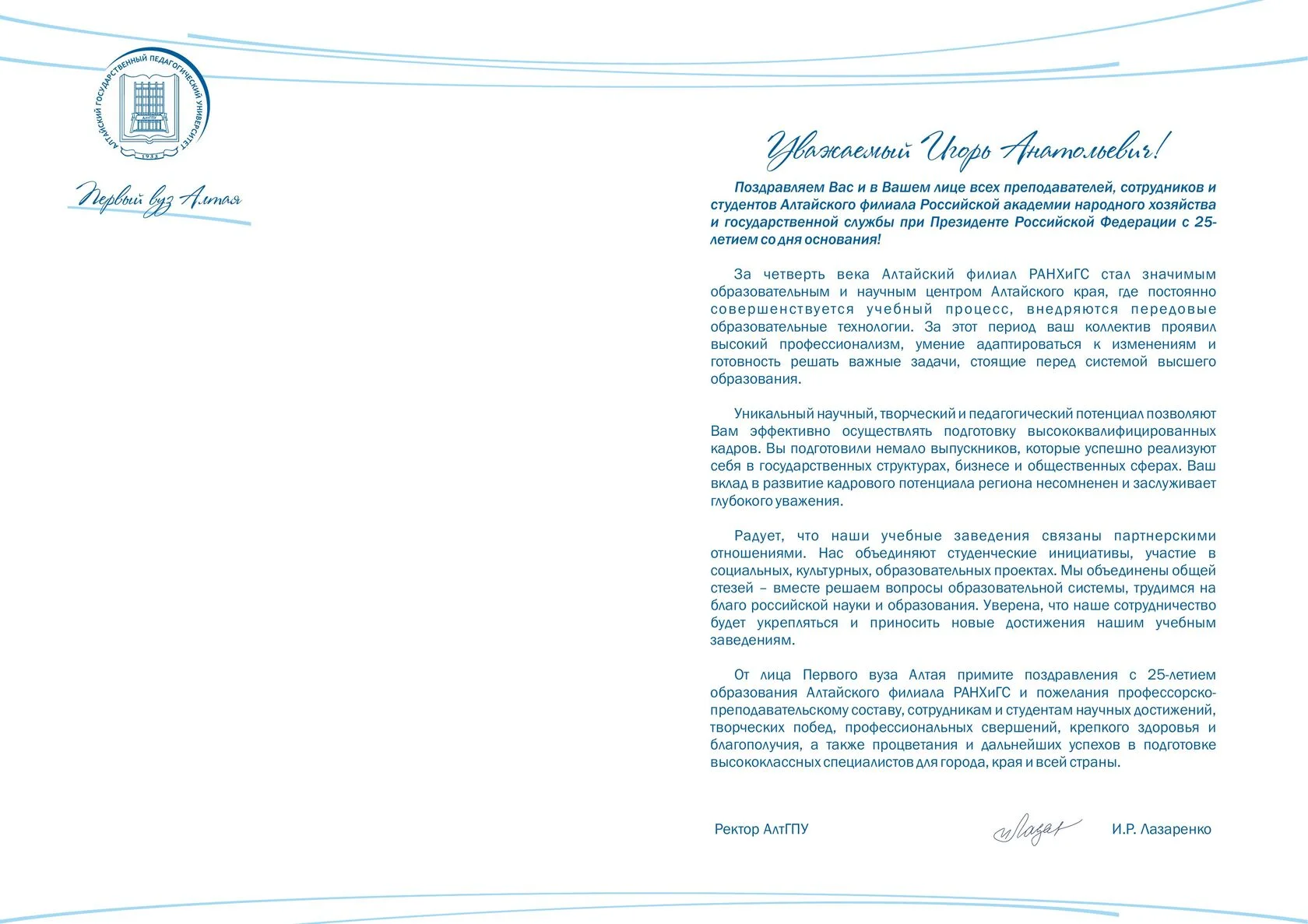 Поздравление от ректора Алтайского государственного педагогического университета Ирины Лазаренко