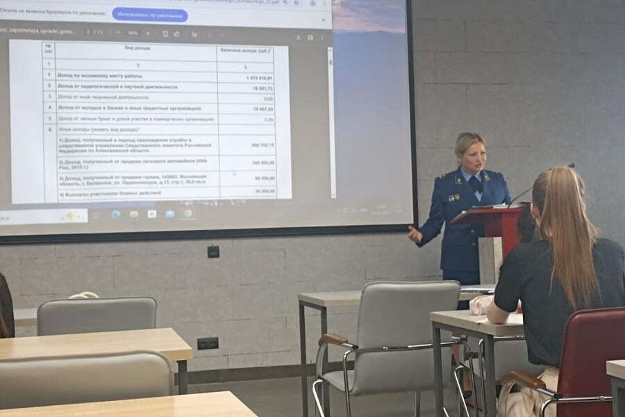 Виктория Турова, начальник отдела по надзору за исполнением законодательства о противодействии коррупции Прокуратуры Алтайского края встретилась со студентами 3 курса направления «Юриспруденция». Виктория Геннадьевна рассказала студентам о работе прокуратуры по проверкам деклараций о доходах и расходах государственных служащих и лиц, занимающих государственные должности. Участники подробно анализировали правила заполнения деклараций, обсуждали «уловки», которые используются на практике для сокрытия нетрудовых доходов, и юридические приемы, применяемые прокуратурой для их разоблачения. Особое внимание уделили практике применения прокуратурой полномочий по обращению в доход государства имущества, которое было приобретено государственными служащими без подтвержденных источников финансирования.