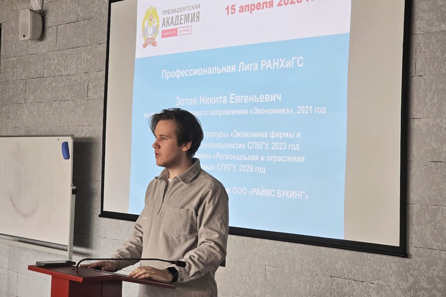 Студенты и выпускник направления «Экономика» Алтайского филиала Президентской академии встретились в рамках проекта «Профессиональная лига РАНХиГС». На встречу с будущими коллегами пришел выпускник 2021 года направления «Экономика» Никита Зотов, ведущий экономист-аналитик ООО «РАЙМС БУКИНГ».
