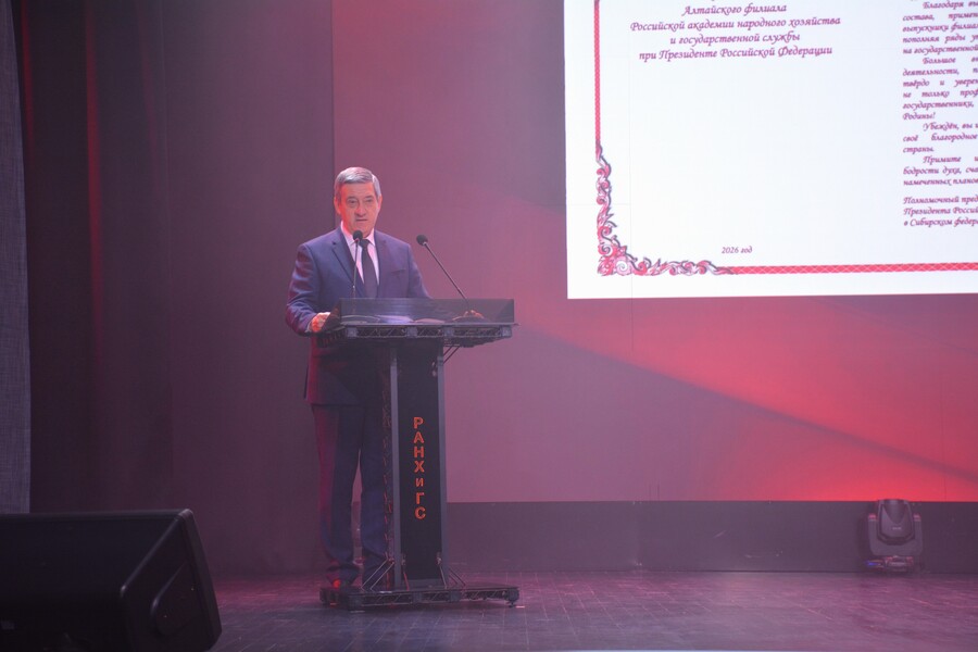 От имени полномочного представителя президента Российской Федерации в Сибирском федеральном округе Анатолия Серышева горячо и сердечно поздравляю вас с прекрасным юбилеем! В вашем заведении много молодости и уверенности, и это здорово, потому что вы творите большое дело на благо нашей прекрасной страны! За четверть века Алтайский филиал достиг значимых результатов в своём становлении и развитии. Сегодня он является одним из ведущих высших учебных заведений не только Алтайского края, но и всего Сибирского федерального округа. Благодаря высокому профессионализму преподавательского состава, применению инновационных методов обучения, выпускники филиала становятся одними из лучших специалистов, пополняя ряды управленческих кадров, которые востребованы на государственной службе и в других сферах деятельности.
