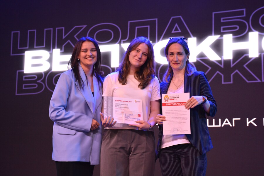 Для приветственного слова и вручения сертификатов участникам проекта на сцену поднялась руководитель проекта «Школа больших возможностей», специалист Центра координации молодёжных проектов и программ Арина Васильченко.