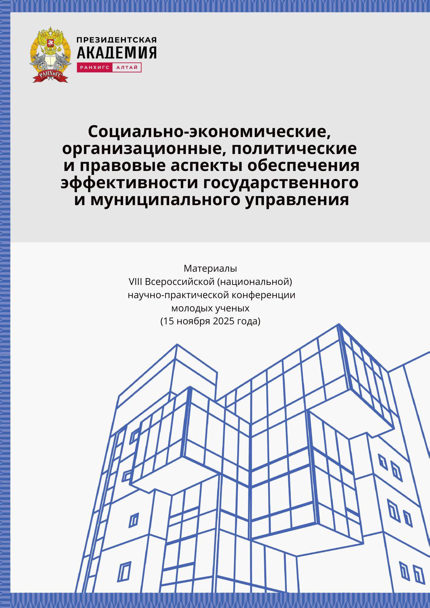 Социально-экономические, организационные, политические и правовые аспекты обеспечения эффективности государственного и муниципального управления: материалы VIII Всероссийской научно-практической конференции молодых ученых (15 ноября 2025 года); Алтайский филиал РАНХиГС. – Барнаул, 2025. – 424 с. Материалы VIII Всероссийской научно-практической конференции молодых ученых (15 ноября 2025 года) будут интересны широкому кругу читателей, в первую очередь государственным и муниципальным служащим, юристам, экономистам, представителям бизнес-сообщества, всем, кто интересуется вопросами психологии и медиакоммуникаций, а также студентам, обучающимся по соответствующим направлениям. В издании рассмотрены вопросы государственного управления и управления качеством жизни населения страны, современные подходы к управлению здравоохранением, структурные преобразования экономики отраслей и регионов, актуальные проблемы права в социальной и экономических сферах, проблемы психологии и социологии, а также перспективы развития регионального медиапространства. |